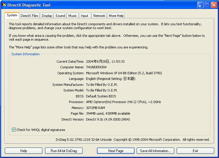 WindowsXP 64-Bit Edition For 64-Bit Extended Systemsは今回から名称が「WindowsXP Professional x64 Edition Version 2003」に変更になり、AMD64のほかにPrescottのPentium4(3.20F/3.40F/3.60FGHz)とNoconaのXeonから実装されたEM64Tにも対応しました。これでAMDとintelの両プラットフォームにインストールできます。うちでは以下のシステムに導入してみました。なお、このOSを以後簡略化のため「WinXP-x64」と呼称することにします。