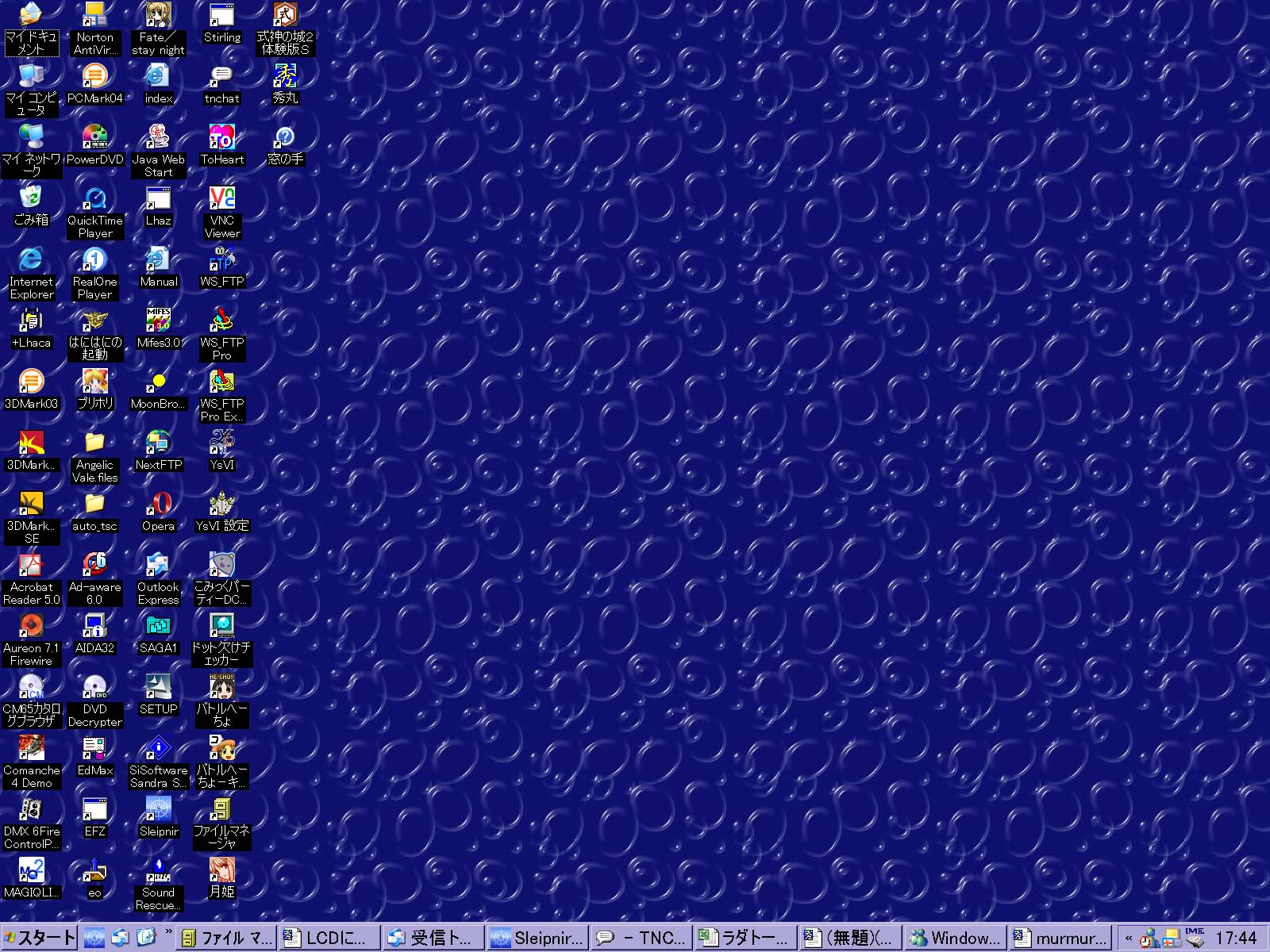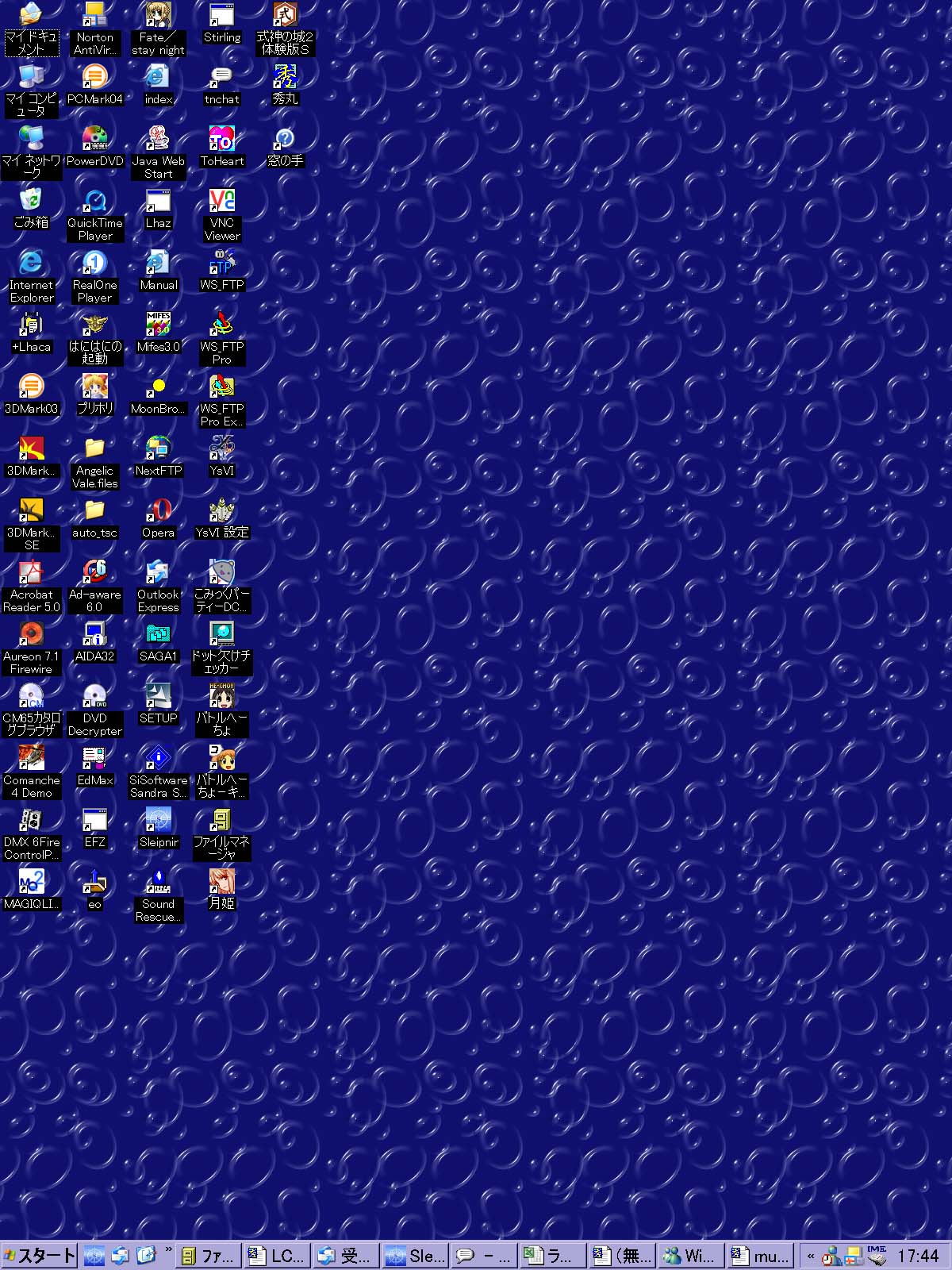 簡単に解説すると、まず紫ナコルルの壁紙が映っているLCDがメインで使用しているシャープのLL-T2020。右にある電源が入っていないのが同じくシャープのLL-T2015で、こっちはPS2(マイコンソフト XRGB-2plus経由で接続)やXeonマシンの画面を映すときに使います。メイン環境がOpteronマシンに移ったこともあって、最近はもっぱらPS2用になってます(もったいない・・・)ちなみに1600×1200のLCDが2台ということで、デジタル接続のマルチモニタもできますが、やってみたらマウスポインタがどこにいったのかわからなくなることがあるという超間抜けな事態が発生し、現在はやっておりません(待て)